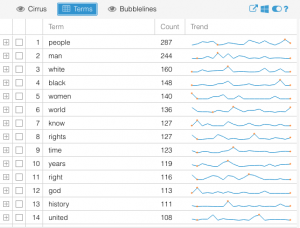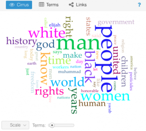 My biggest takeaway from this project has been how incredibly difficult it is to draw conclusions based on text analysis alone. There are so many variables that have gone into each one of these speeches, from date, location, ideology of speaker, race, social context, cultural tone differences, and many more. One trend I did find more consistent than others was a tone of aggression from the African American Speaker’s in the corpus (with the exception of King’s Nobel Peace Prize Speech). I also realized that this tone recognition was far more apparent to me in the text analysis visualizations after having read the speeches which led me to recognize the limitations of Voyant in terms of “sentiment analysis.” This could be a good place to use Gephi for the same data if I or anyone else wanted to delve further into this analysis. As far as location and date, I was unable to draw any significant conclusions from the textual tendency similarities/differences of speeches with similar inputs.