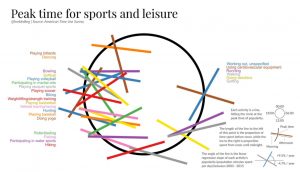 I chose the following two visualizations because they stood out to me as being poor visual representations of data. The first (how india eats) has percentages that appear to be supposed to correspond to fractions of a circle that are not proportionate at all. The second (peak time for sports and leisure) is incredibly confusing in it’s nature, and although it was rather clever when I was able to finally decipher it, it took almost 10 minutes which is far too long for most readers hoping to see and understand quickly.