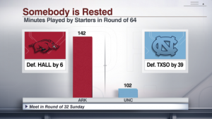 - This visualization utilizes a “lie factor” significantly higher than one to emphasize statistical imbalance (due to teams using five starters, it may also be more informative to show how Arkansas’ additional forty minutes of action was divided amongst its starters).
